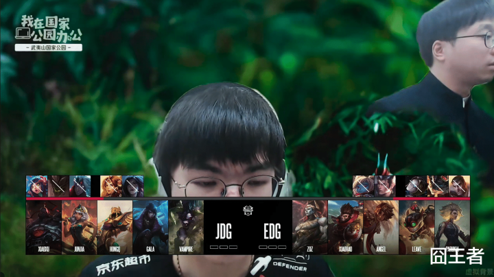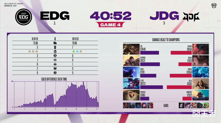 第四局比赛,EDG蓝色分,禁用:蔚;妮蔻;塞拉斯;贾克斯;卢锡安,采取:Zdz鳄鱼;Xiaohao杰斯;Angel瑞兹;Leave薇恩;Parukia巴德;JDG红色方,禁用:发条;辛德拉;小火龙;塞纳;泽丽,采取:Xiaoxu剑魔;JunJia石头东说念主;HongQ冰鸟;GALA希维尔;Vampire布隆