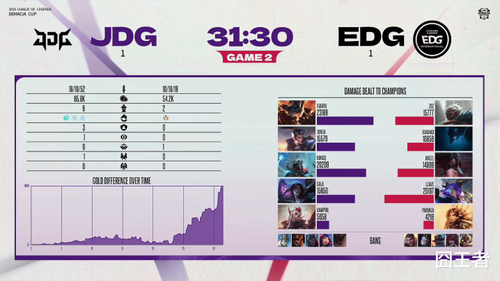遵守第二局比赛,JDG莫得再犯上一局得东说念主诞妄,他们 得到上风,就大举伏击。10分钟阁下,JDG三包一越塔下路,Leave芸阿娜完好处分完成1换2;16分钟阁下,Angel阿卡丽一波运动操作,得手单杀Xiaoxu兰博;23分钟阁下,Xiaoxu兰博起首被秒,EDG拿下厄塔汗但后续JDG追击奏效竣工;26分钟阁下,Angel阿卡丽强行进场,EDG被动开团殉难三东说念主随后JDG拿下大龙;最终31分30秒,JDG团灭EDG,扳回一局!
