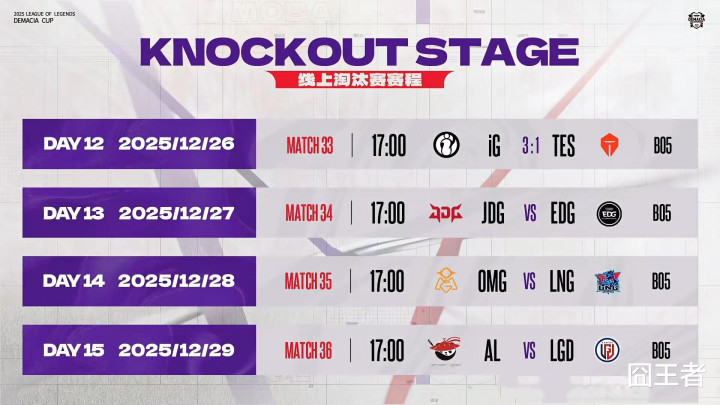 历程一周的搏杀,iG,JDG,EDG,OMG,LNG,LGD六支战队晋级。他们和种子战队TES和AL,将分为高下半区,进行线上淘汰赛。分组情况如下:上半区:AL,EDG,JDG,LGD;下半区:TES,LNG,iG,OMG。