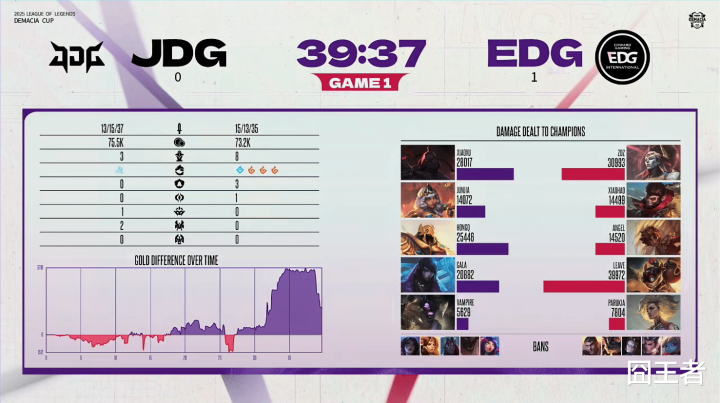 遵守第三局比赛,被JDG打成了“冗长”的碾压局。前15分钟中,两队打得相比胶著,经济无法拉开差距。17分钟阁下,JDG起首拿下小龙但迟迟不退,EDG收拢契机完成0换2;22分钟阁下,团战拉扯打出差距,JDG团战完胜趁势拿下小龙与厄塔汗;32分钟阁下,EDG颓势团战展示韧性,击杀JDG野辅后得手拿下大龙;35分钟阁下,仍有悬念,Leave起首被秒但Angel抢下关节小龙;最终39分30秒,JDG团灭EDG,再赢一局!